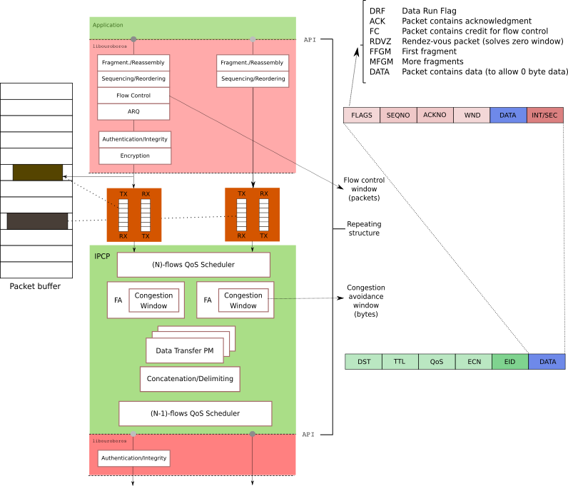 The above four functions are grouped together in the FRCP transport protocol. The protocol can be disabled in its entirety: Ouroboros delivers packets as they arrive, doesn’t recover lost packets, drops packets that are too big, etc.). When FRCP is disabled, the headers are not even added to the packet. From the perspective of the endpoints, this is similar in service to UDP/IP. Or some functions can be disabled separately, such as ARQ, then you have something like UDP but with flow control. We will not go into the details of the operation of FRCP here.